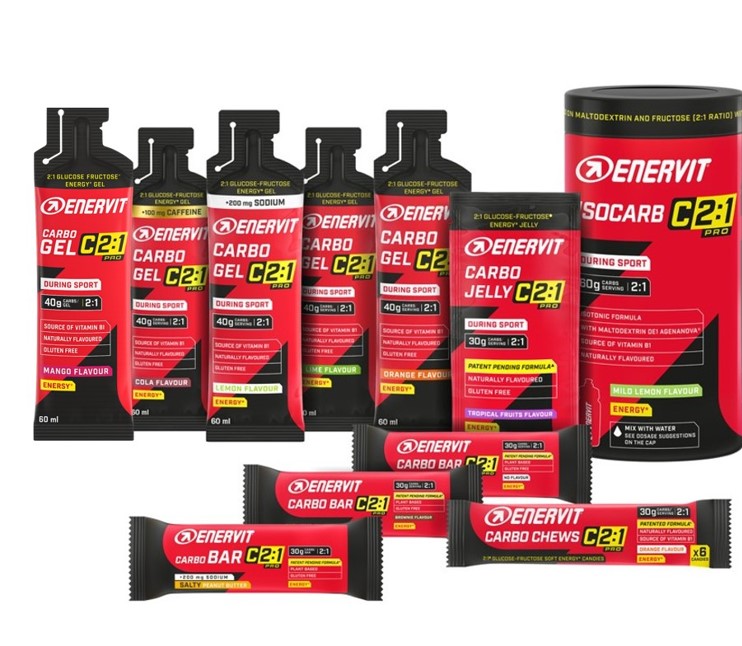 - 3x ENERVIT Carbo Gel C2:1 - energetický gel se 40 g sacharidů v jedné dávce, kombinace maltodextrin:fruktóza 2:1; příchuť pomeranč, limetka a mango (v případě nedostupnosti jedné z nich bude nahrazeno)
